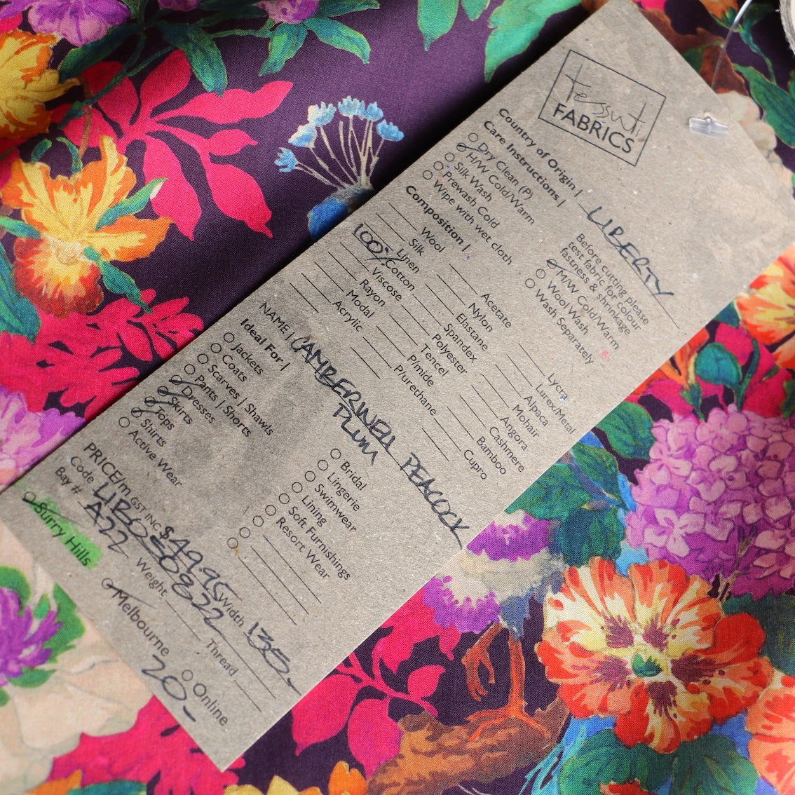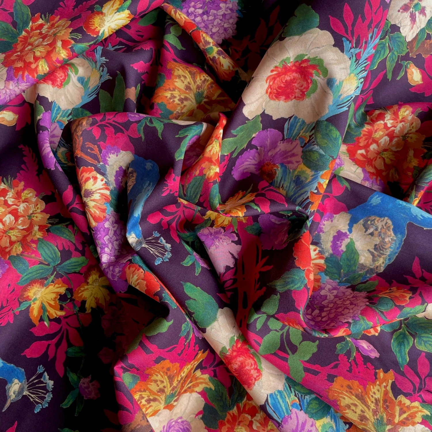 Liberty Fabrics Archivist’s Edit plum floral/peacock printed 100% cotton Tana Lawn™