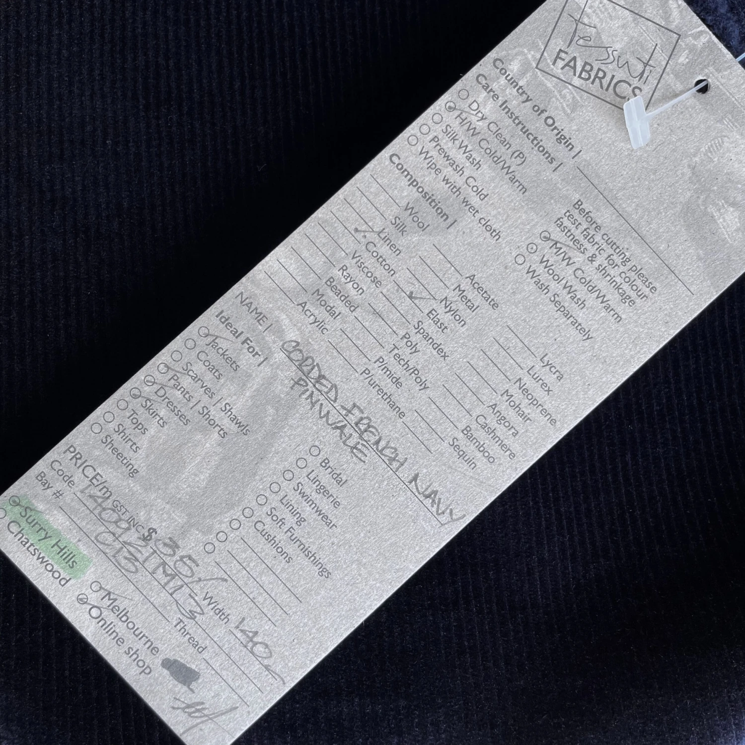 French navy 98% cotton 2% elastane stretch 11 pinwale corduroy