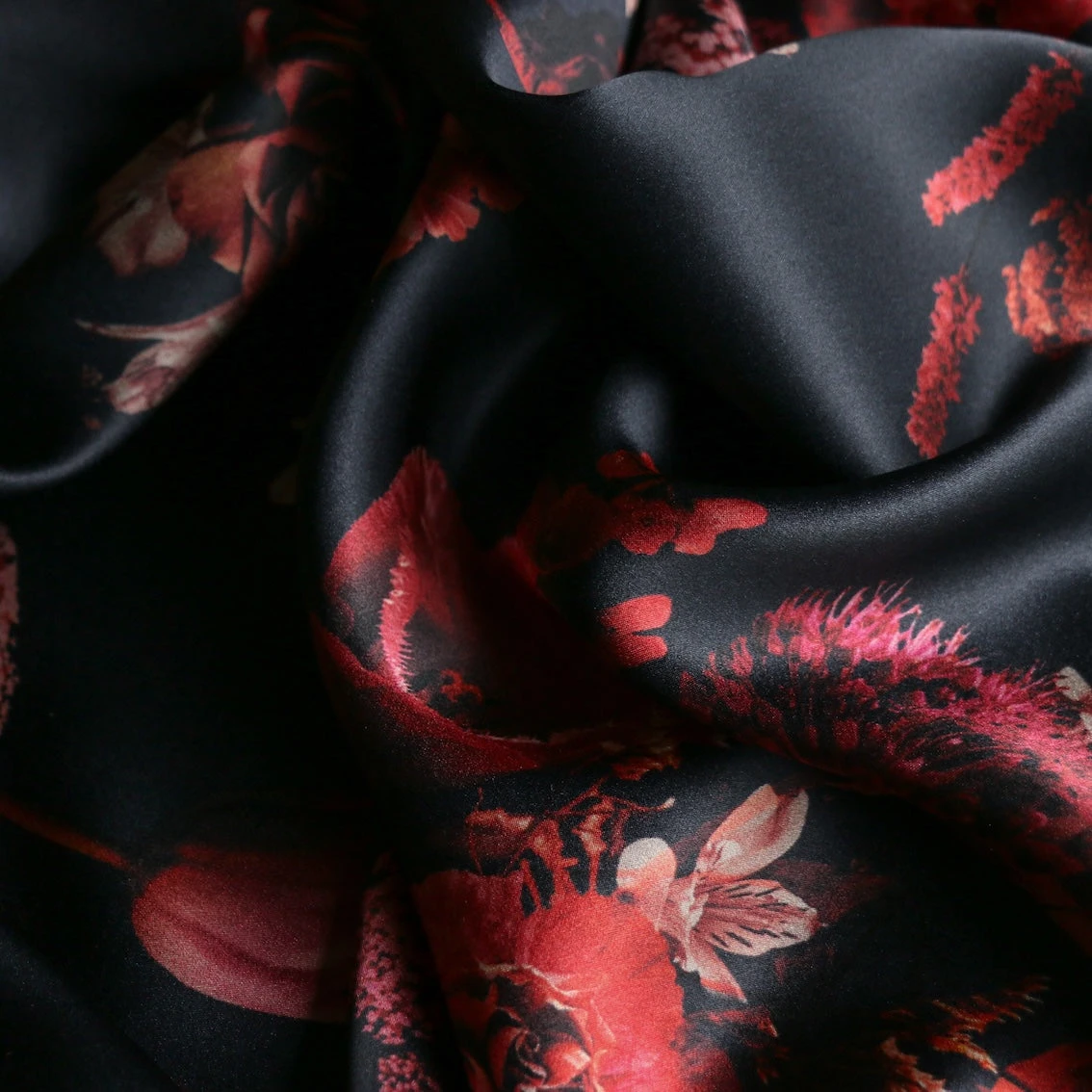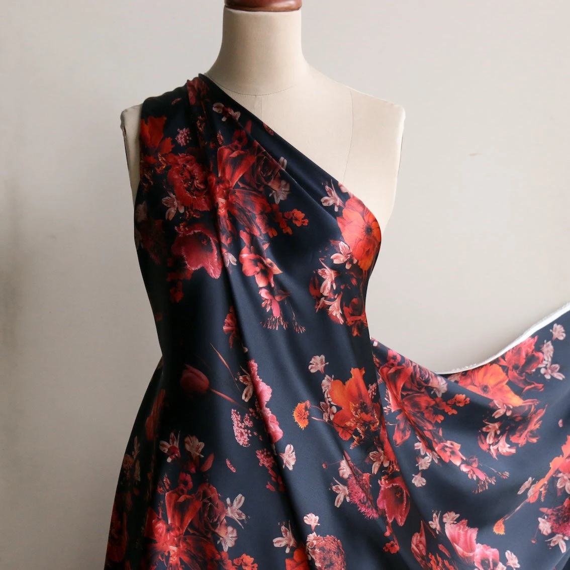 Digital irredescent raspberry/burnt orange/russet florals on navy 100% silk satin