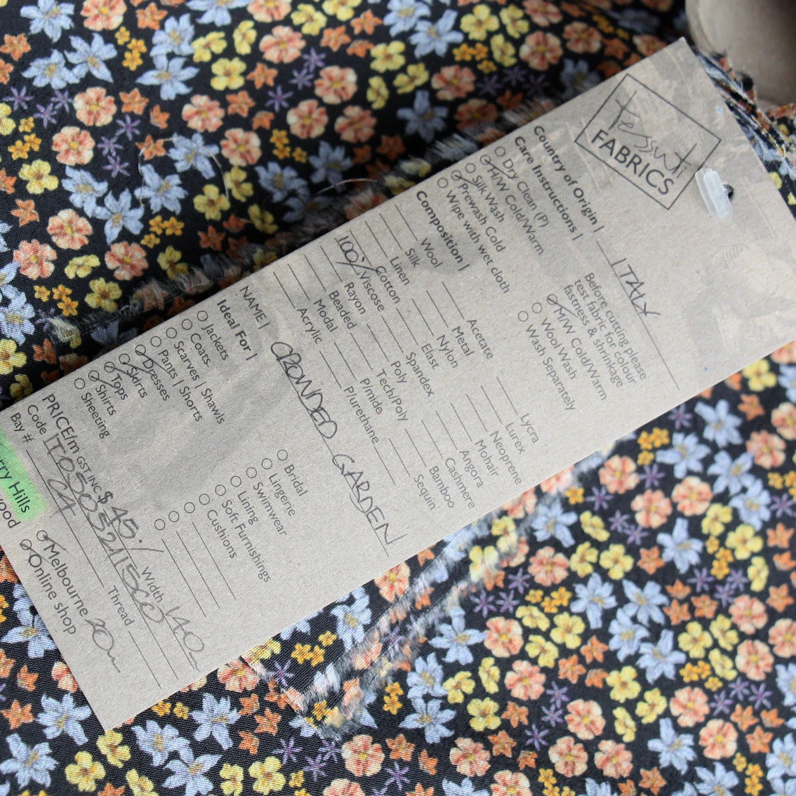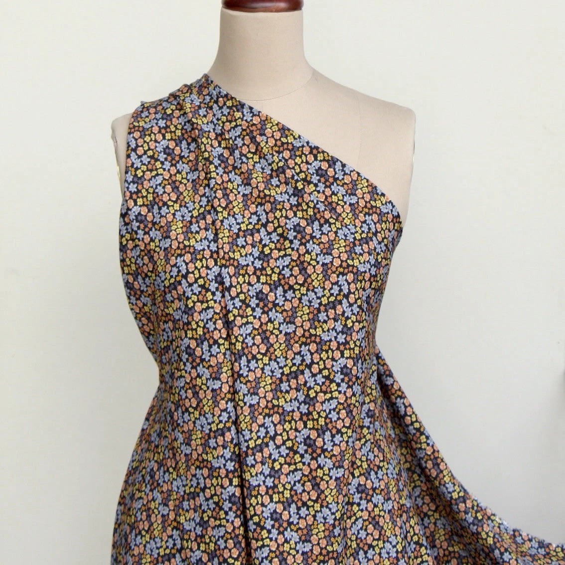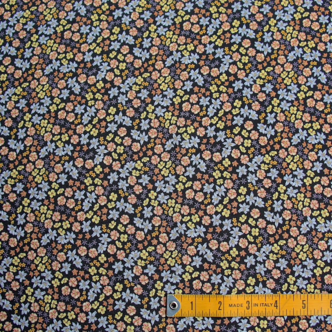 Italian designer burnt orange/wedgewood blue/olive on black floral 100% viscose crepe.