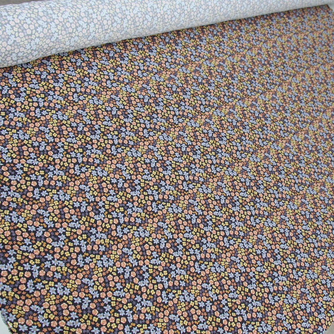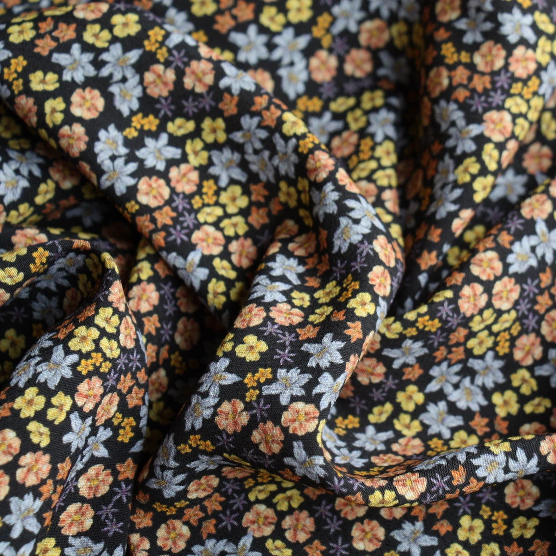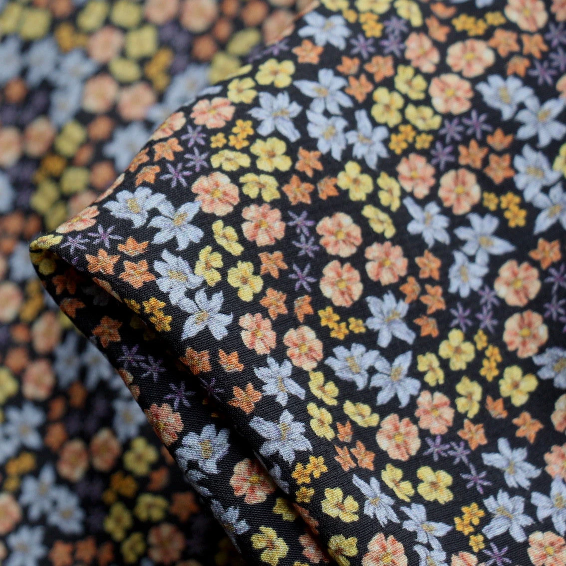 Italian designer burnt orange/wedgewood blue/olive on black floral 100% viscose crepe.