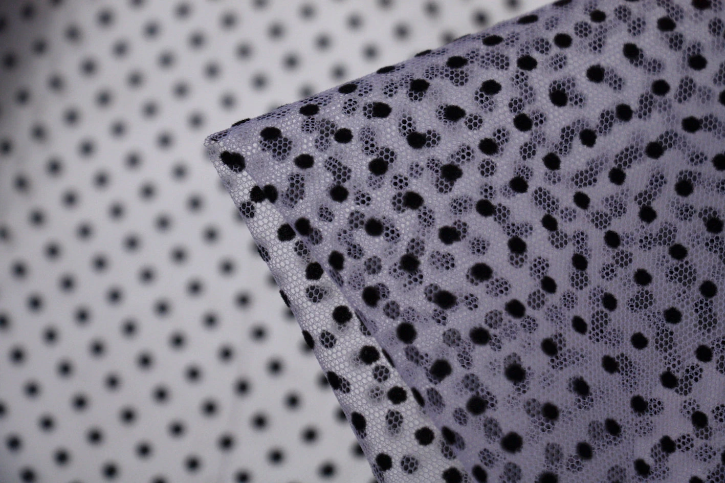 Lavender nylon tulle with black flock spot. Width:150cm