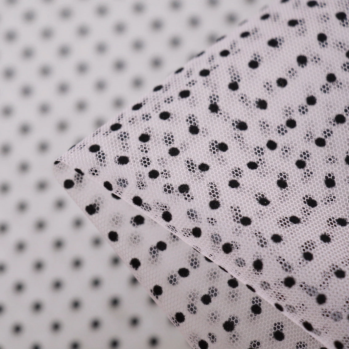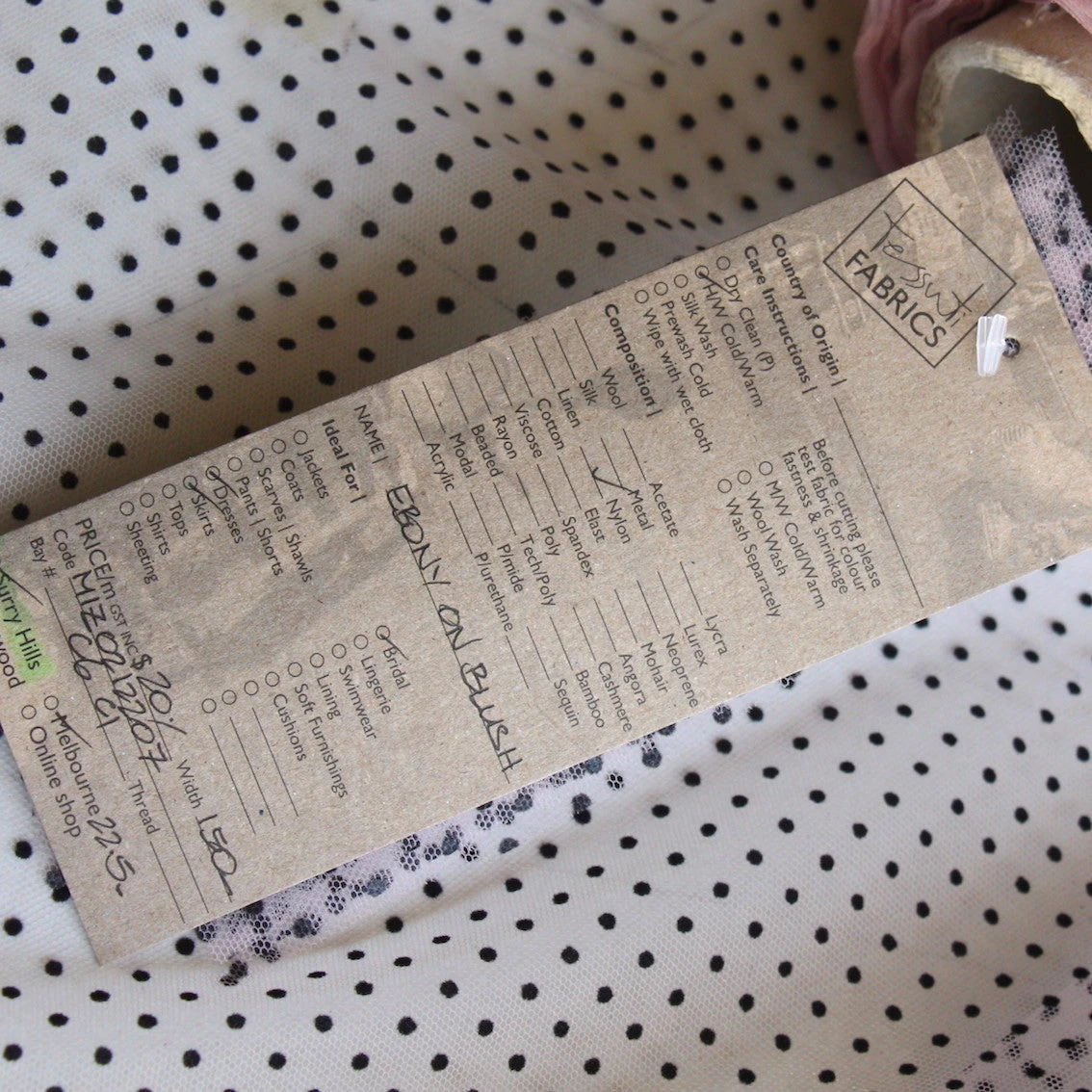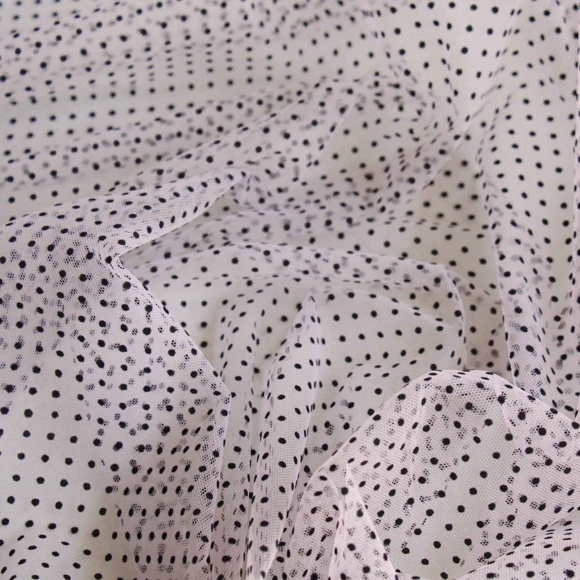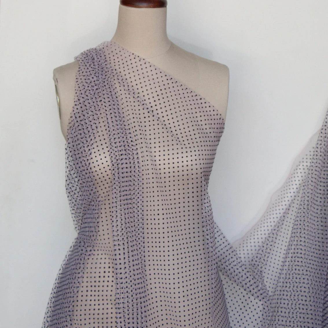 Designer end blush pink 100% nylon tulle with black flocked spot. Width: 150cmÂ