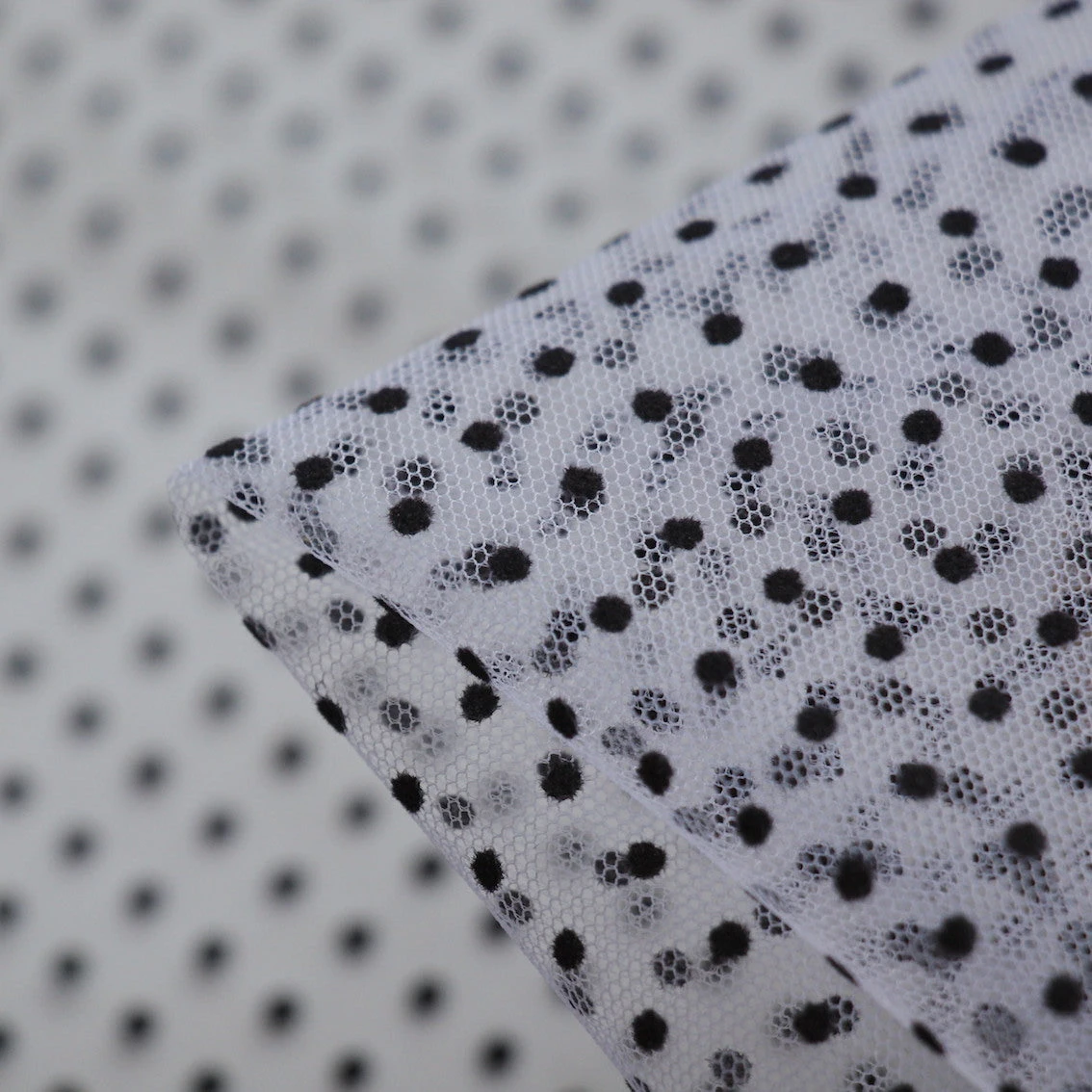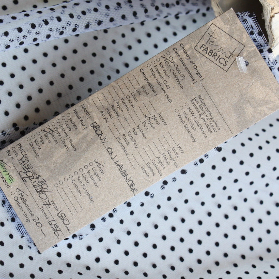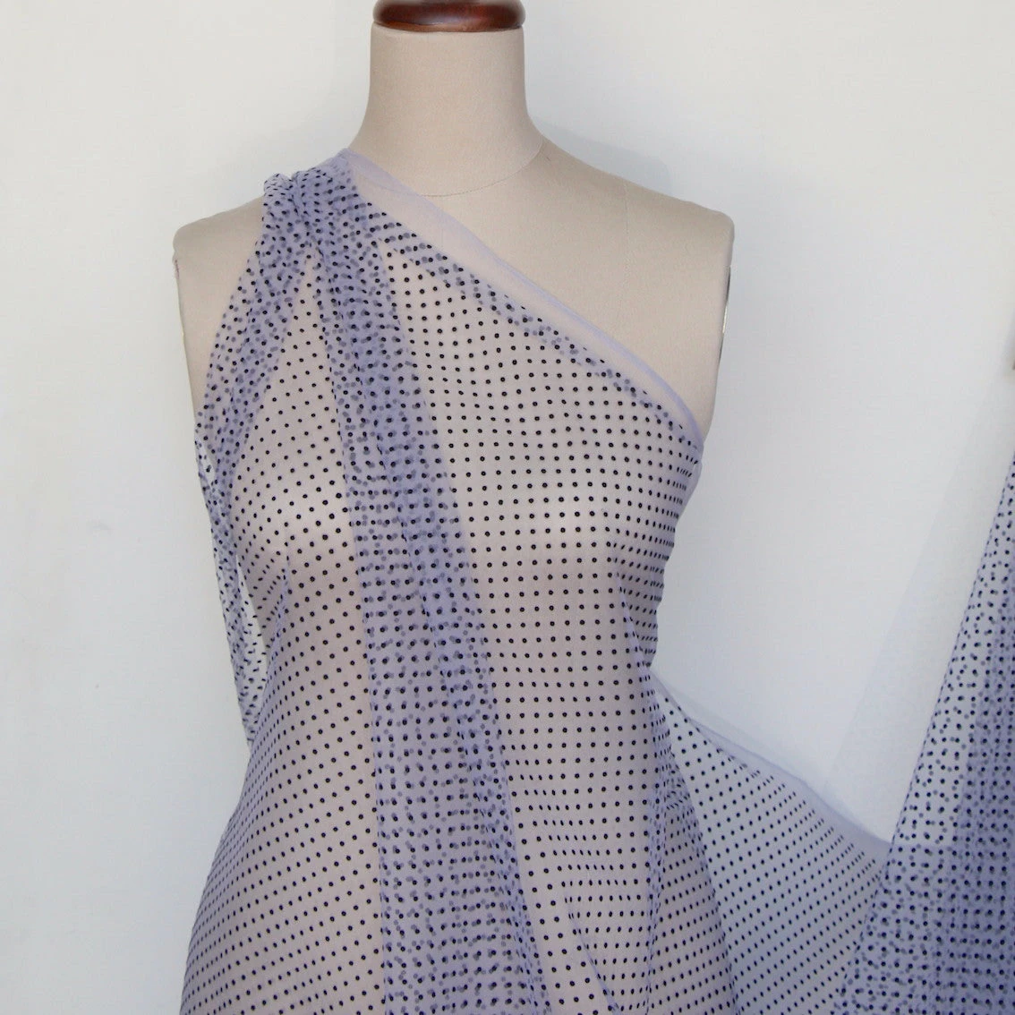 Designer end lavender blue 100% nylon tulle with black flocked spot. Width: 150cmÂ