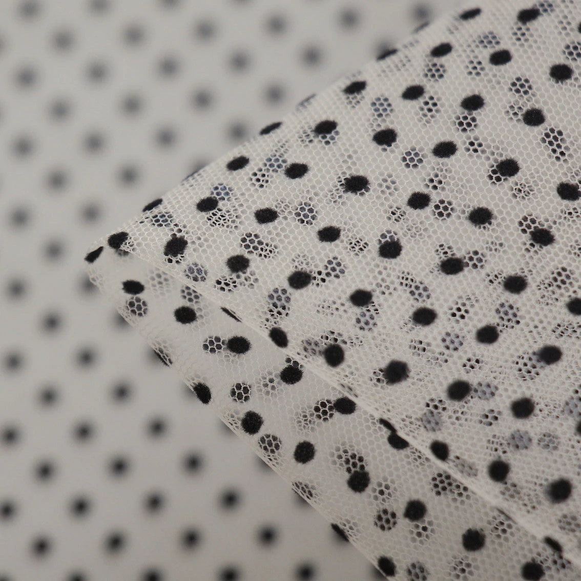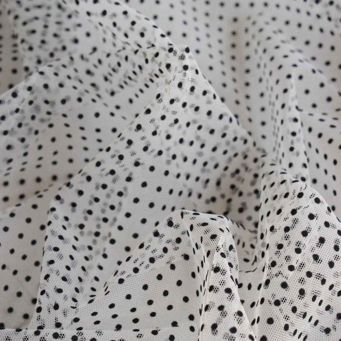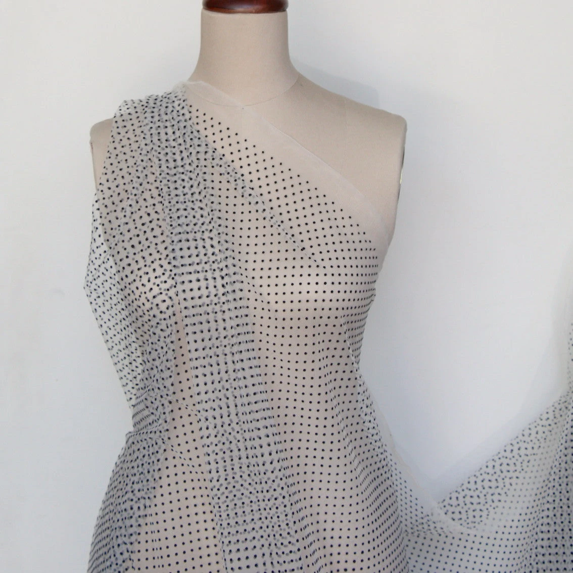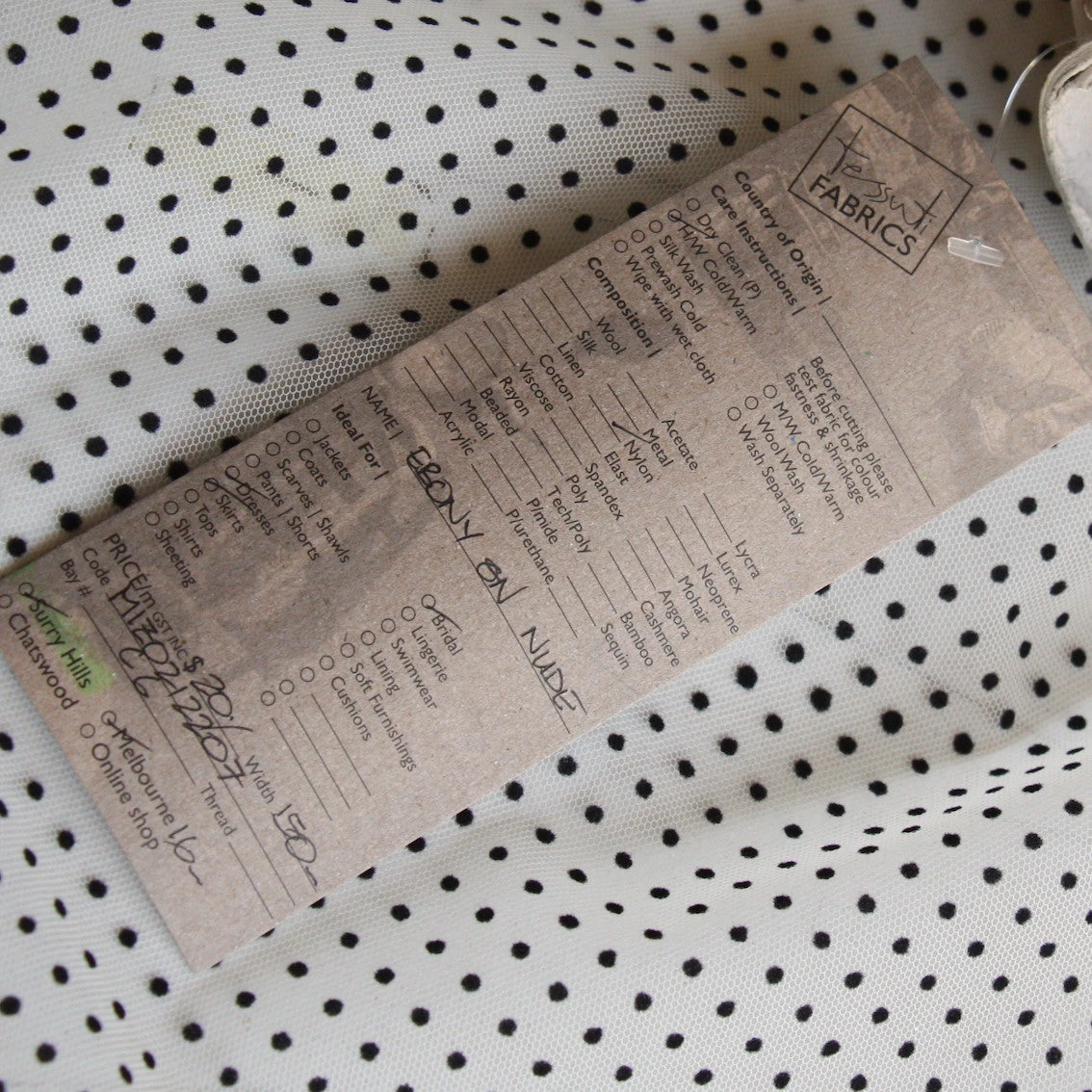 Designer end nude 100% nylon tulle with black flocked spot. Width: 150cmÂ