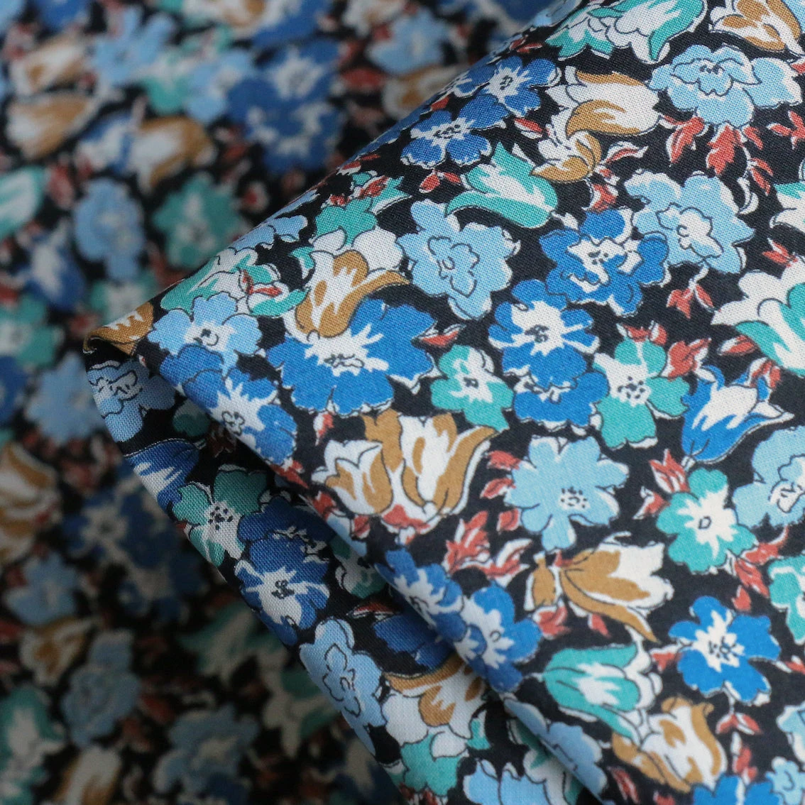 Liberty Fabrics ‘A Liberty Odyssey – Earth’ collection black/sky/teal/bluette floral 100% cotton tana lawn™