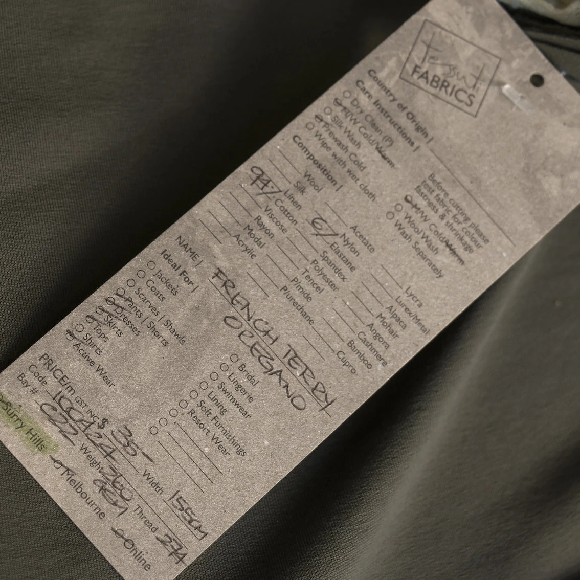 Oregano/tapenade 94% cotton 6% spandex loopback French terry knit