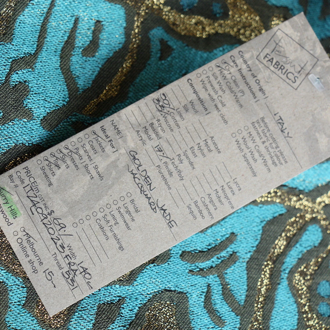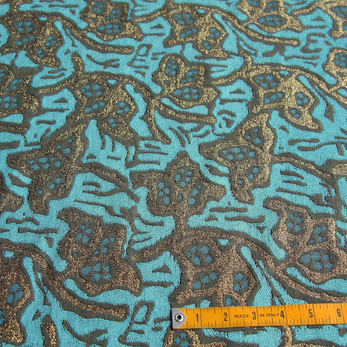 Italian designer jade green/dark gold floral cotton/viscose/polyamide with gold lurex accents. Width: 145cm