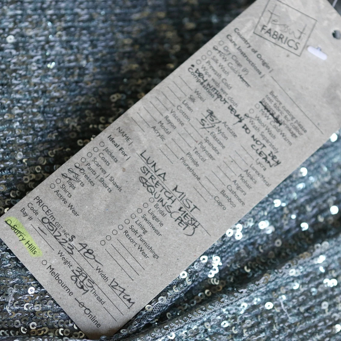 Iridescent mist/eau de nil blue small PET sequins on grey stretch mesh 95%Â nylon 5% elastane.
