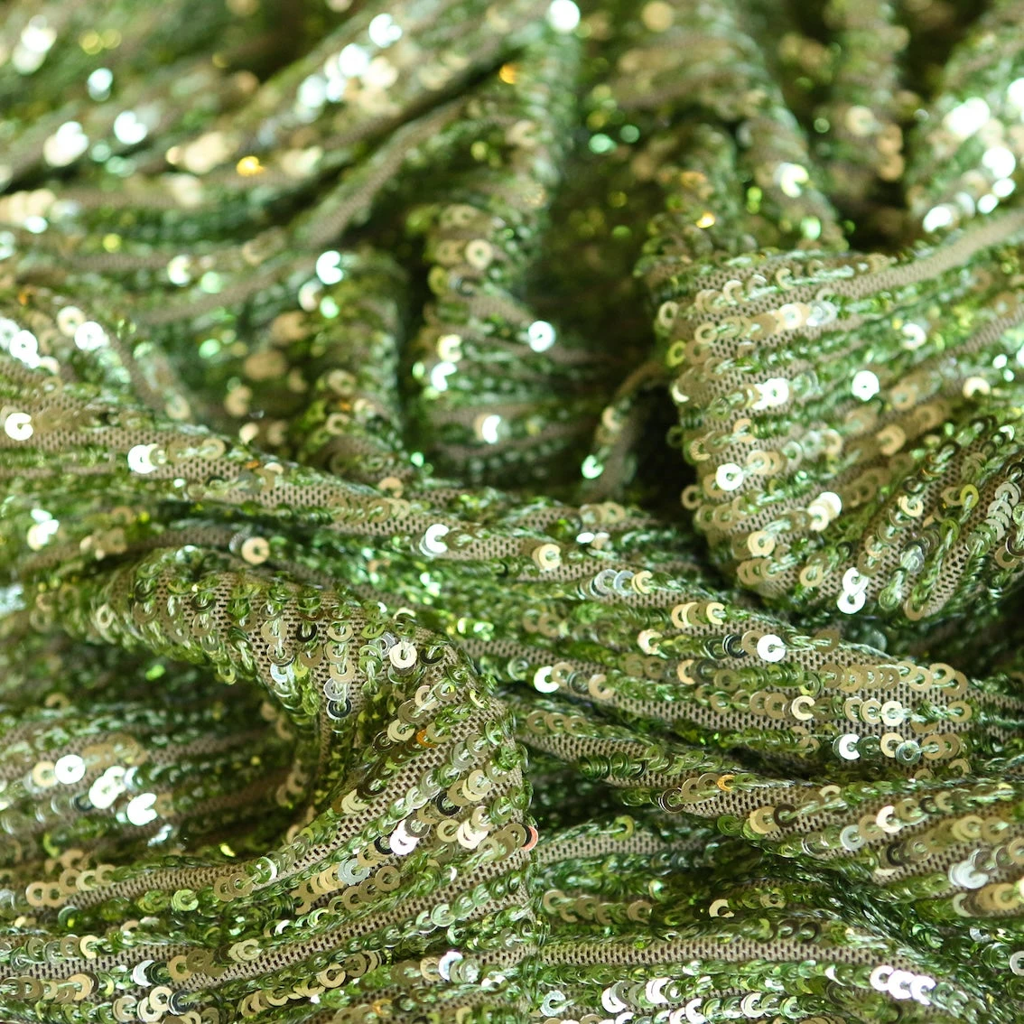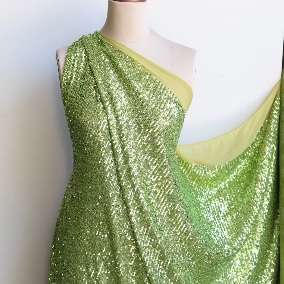 Iridescent wasabi green small PET sequins on green stretch mesh 95% nylon 5% elastane.