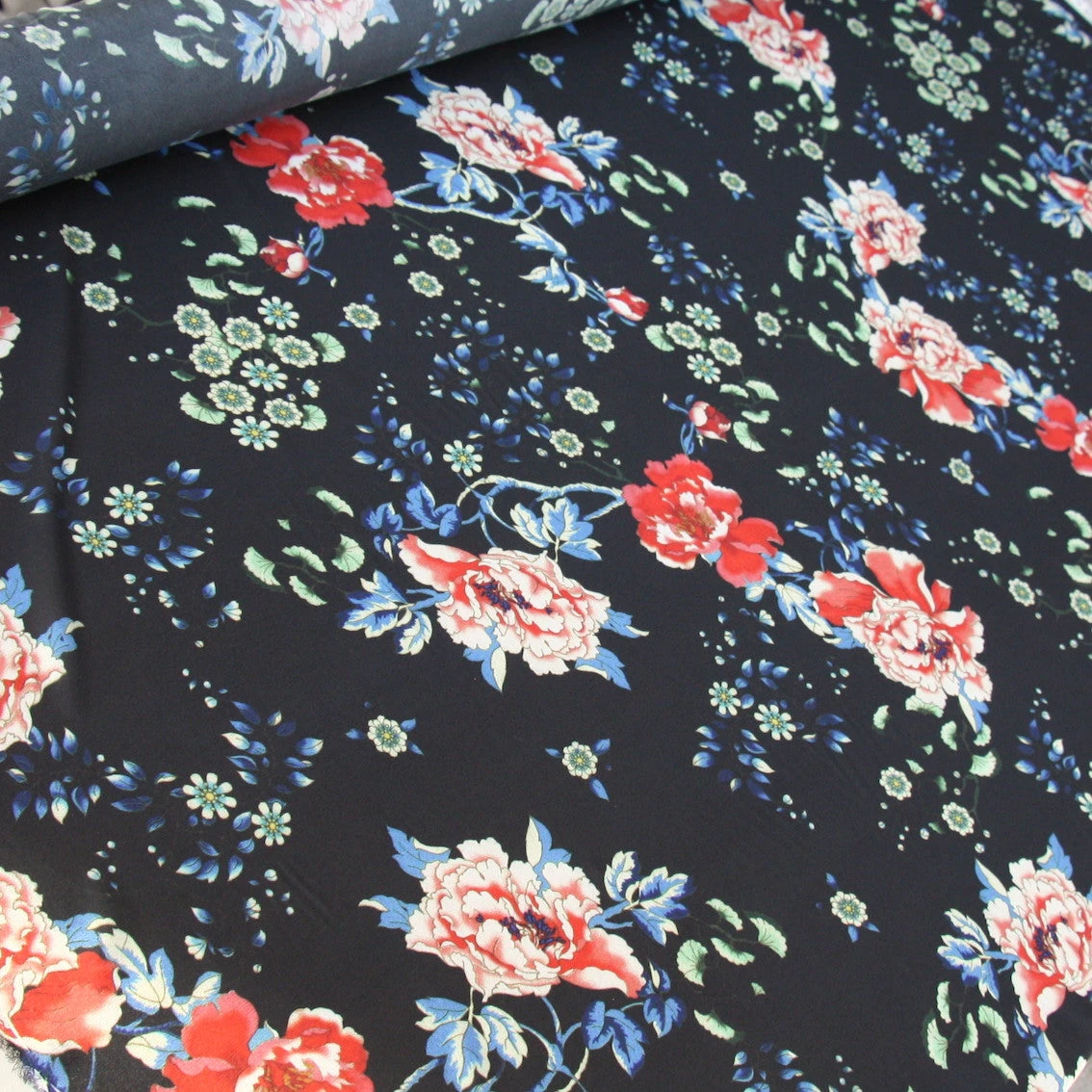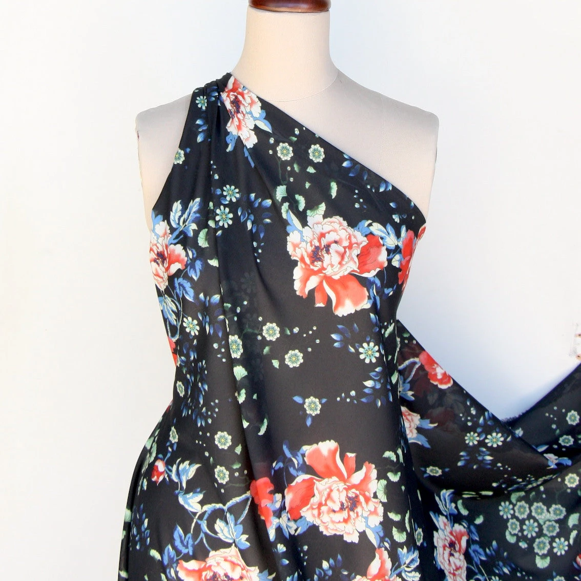 Italian designer red floral/black printed silk/elastane chiffon