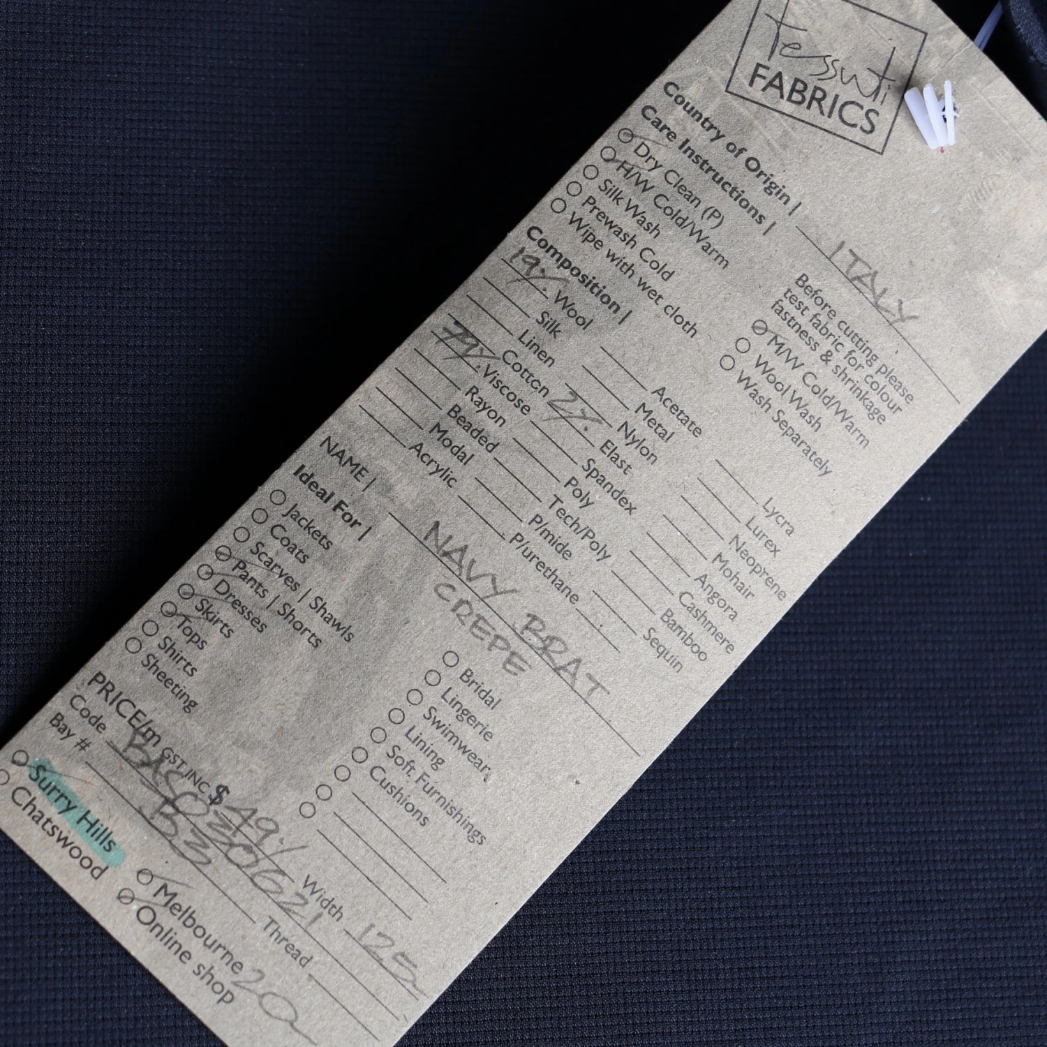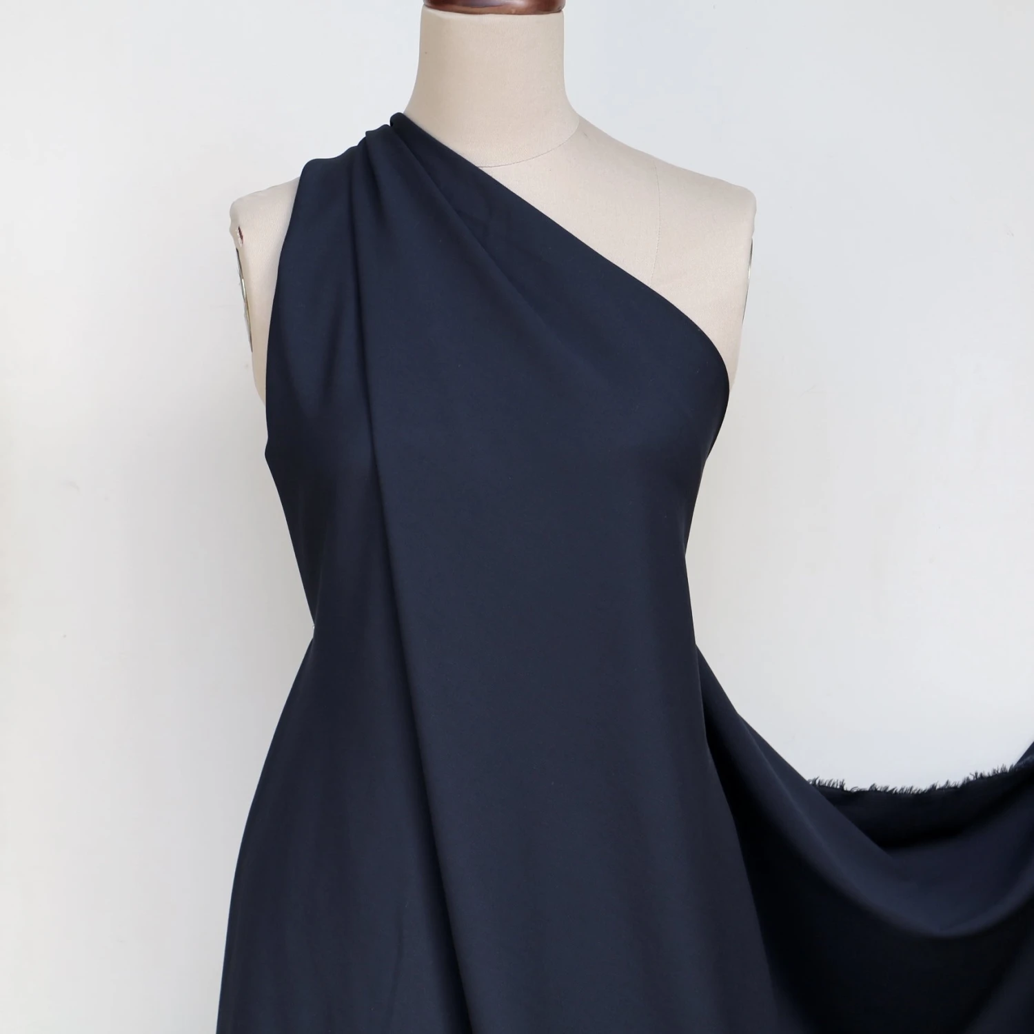 Designer Italian navy 79% viscose 19% wool 2% elastane stretch woven.