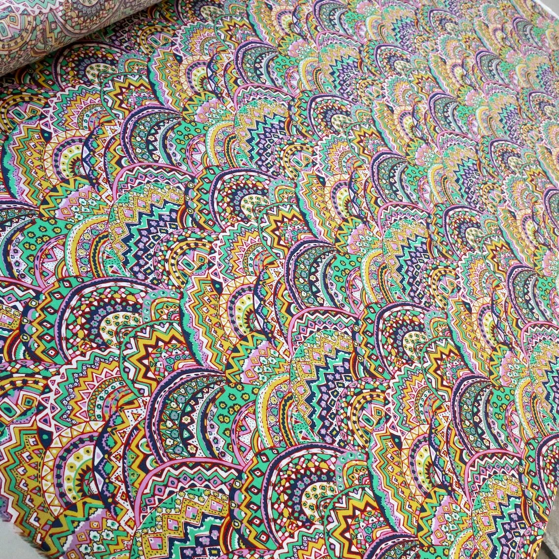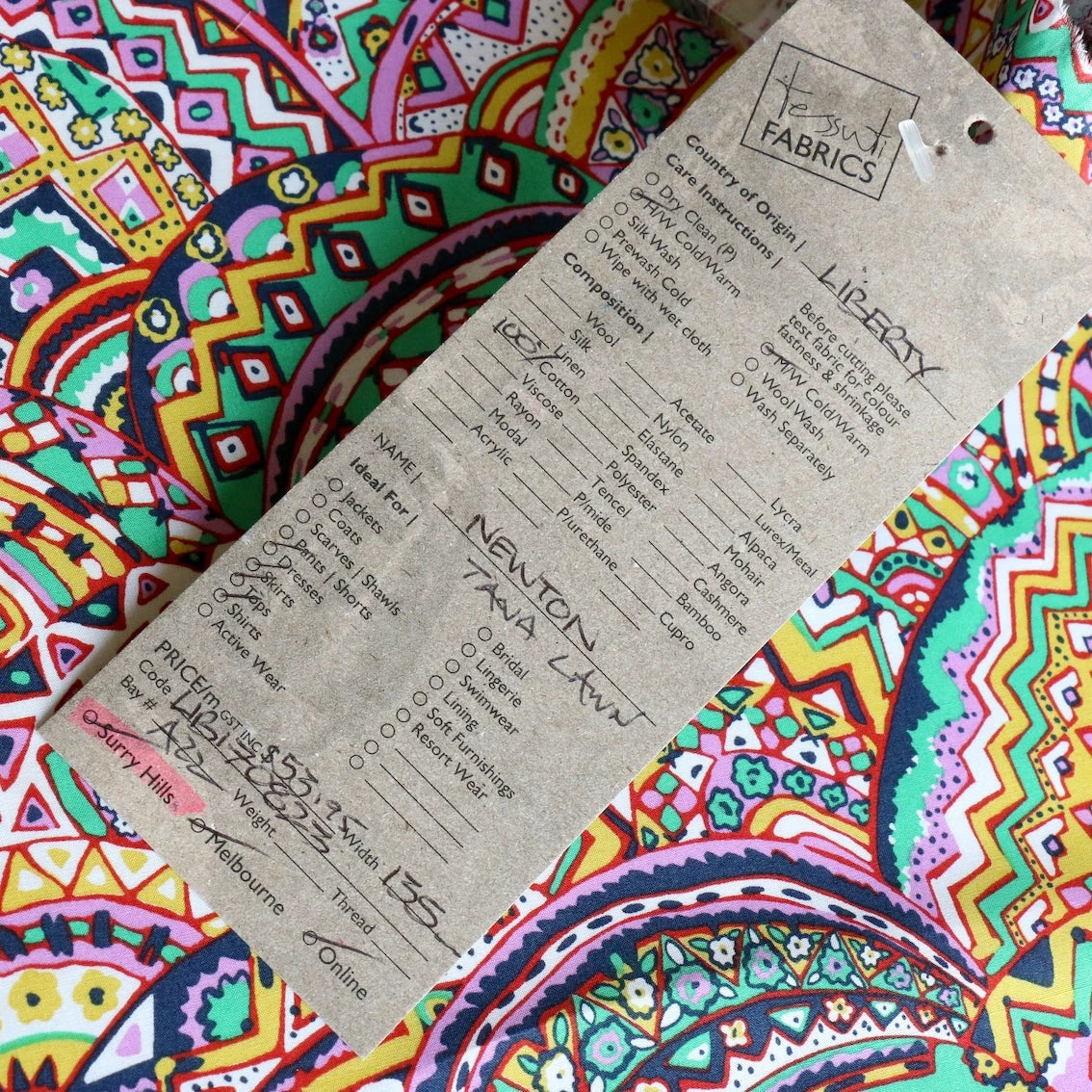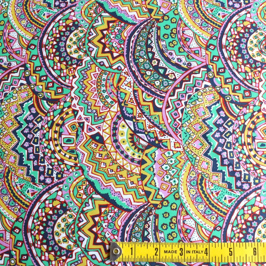 Based on a Liberty design from the early 1980s, Newton has been reworked into a vibrant abstract geometric. Its hand- painted semicircles of flowers, chevrons and stripes overlap one another to form a celestial kaleidoscope, suggestive of imaginary rainbow realms.