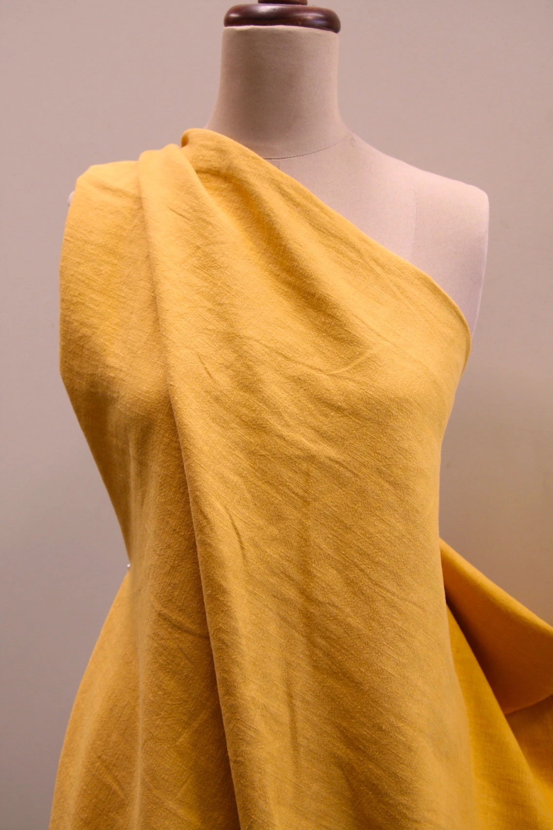 Ochre/mustard yellow pebble washed textured 100% linen. Width: 140cm