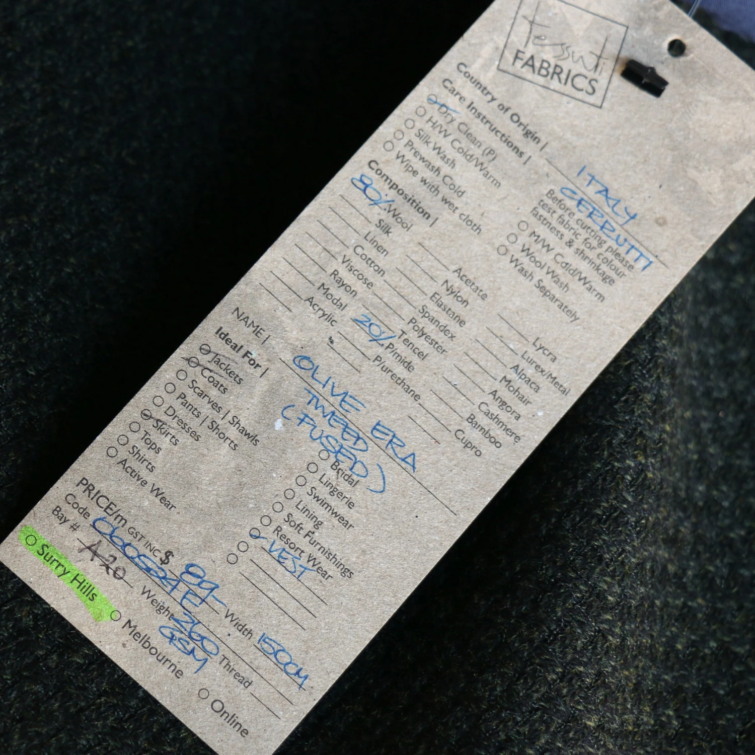 Italian olive green melange tweed 80% wool 20% polyamide with interfaced backing