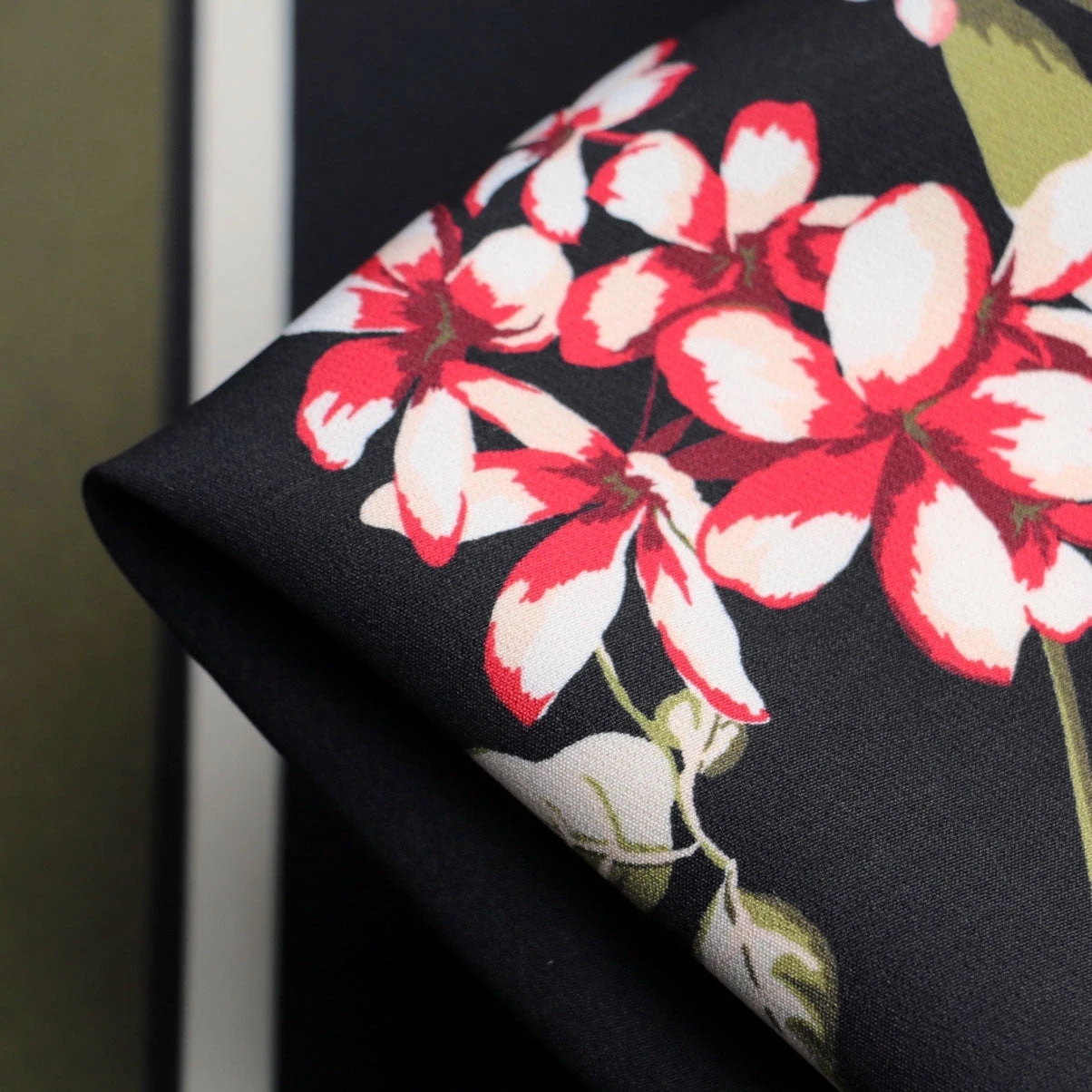 Designer black floral printed 87% polyester 13% elastane stretch crepe