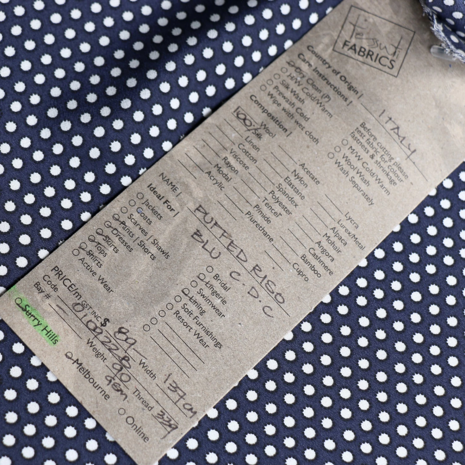 Italian navy/off white polka dot printed 100%Â silk crepe de chine