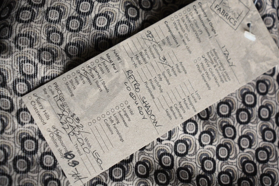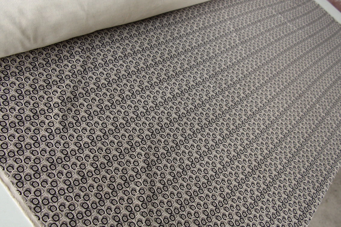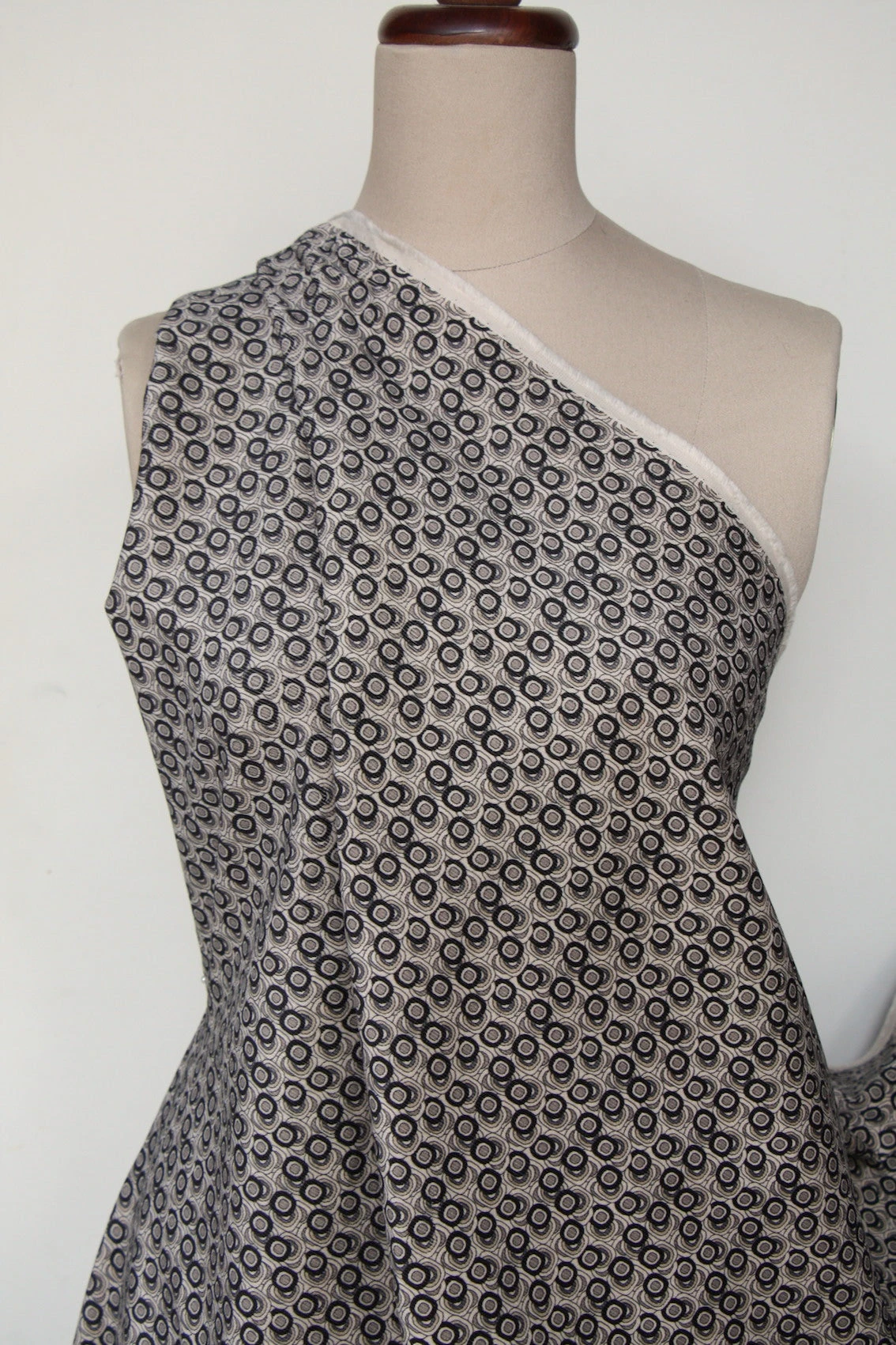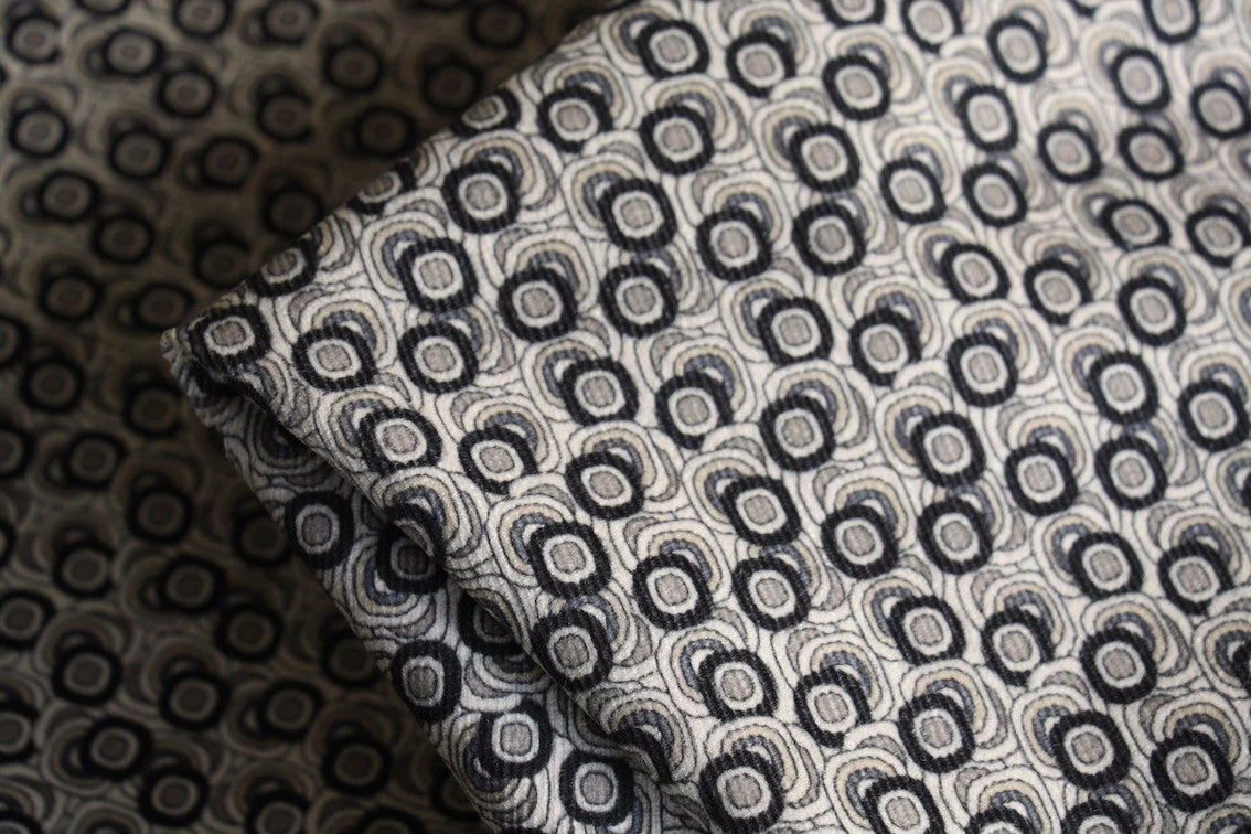 Italian 97% cotton 3% elastane taupe grey/black on sand printed stretch pinwale corduroy.