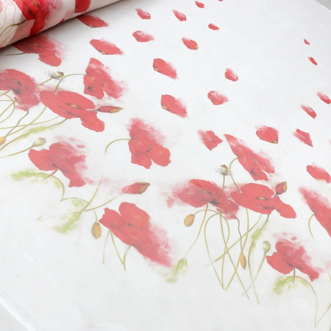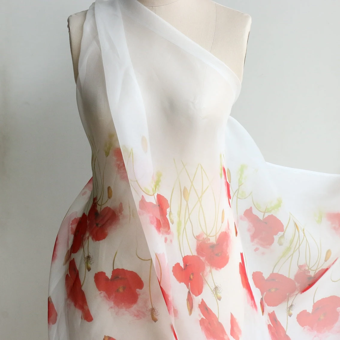 Italian designer ivory/red poppies digitally printed 100% silk organza