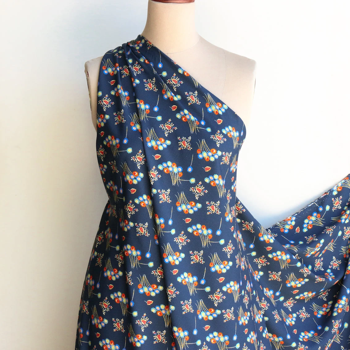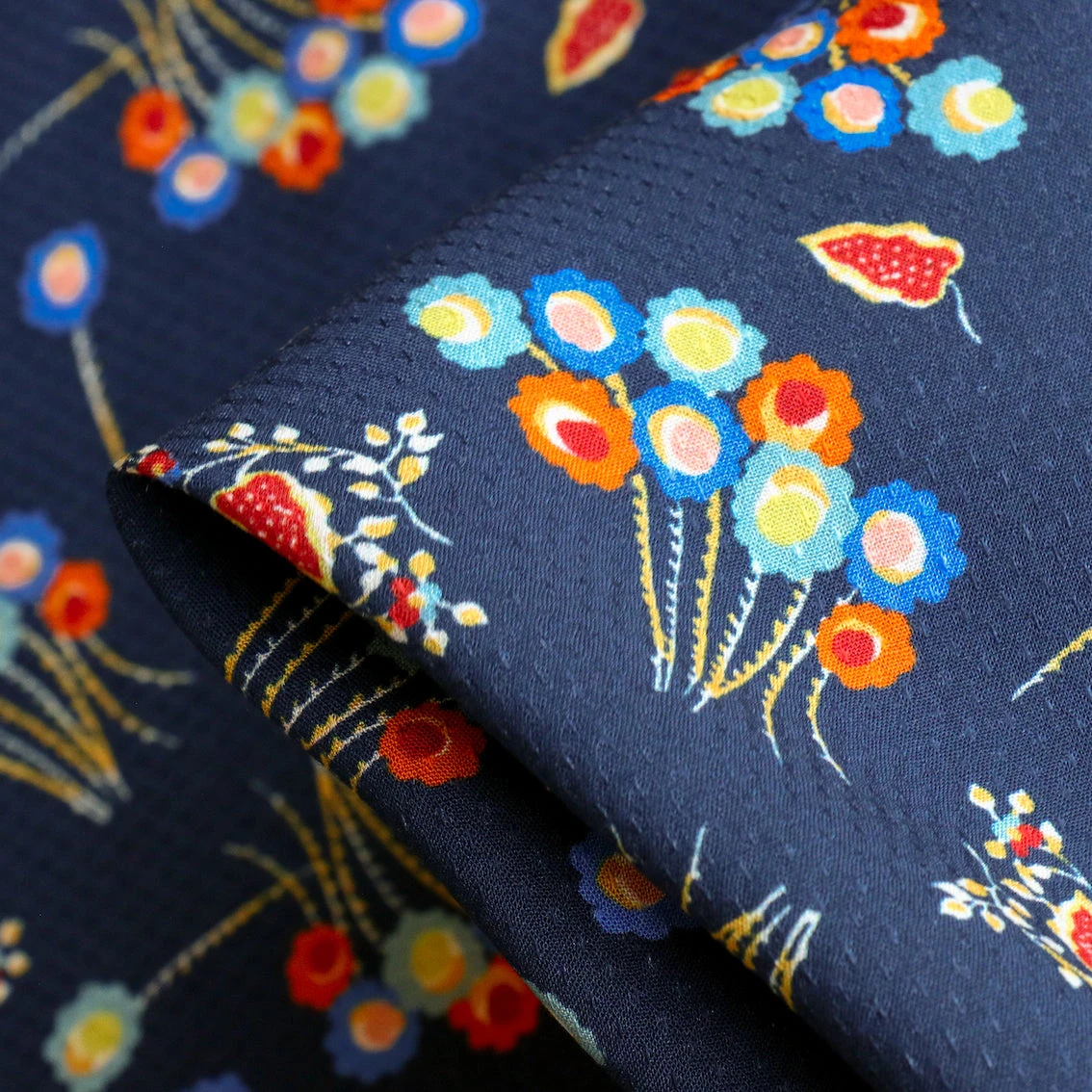 Italian navy/cobalt/russet floral printed 100% viscose challis with jacquard spot