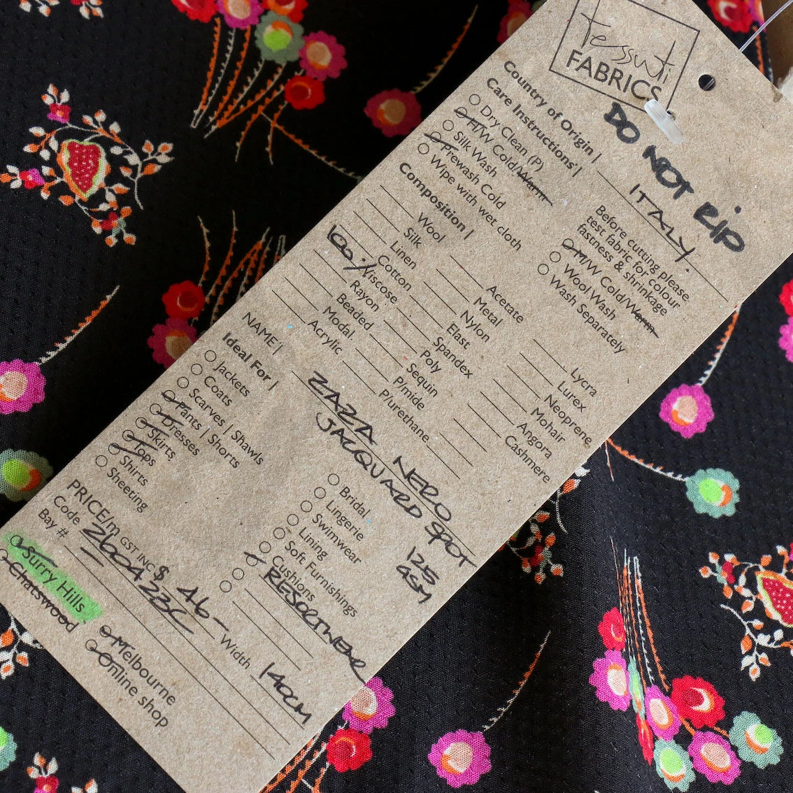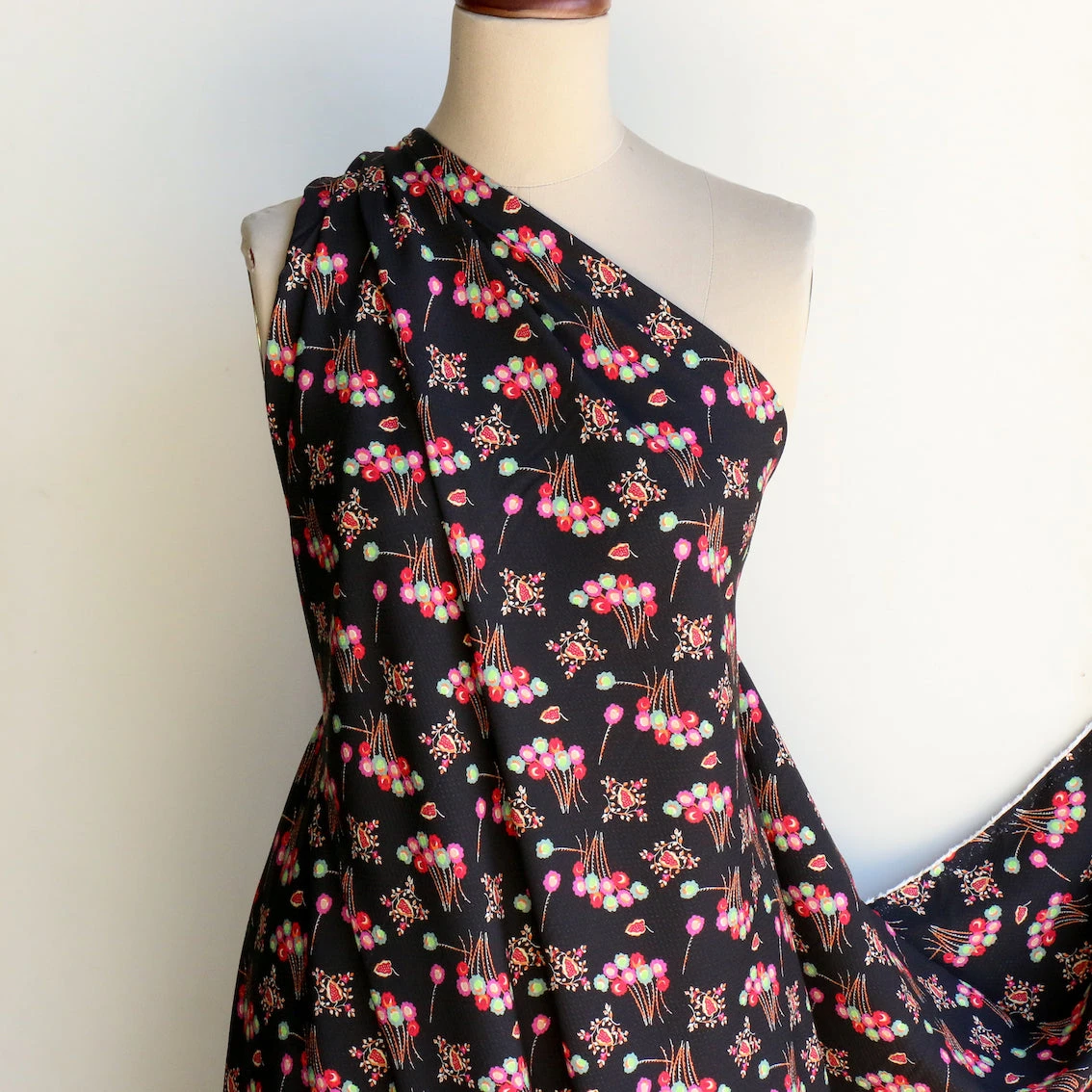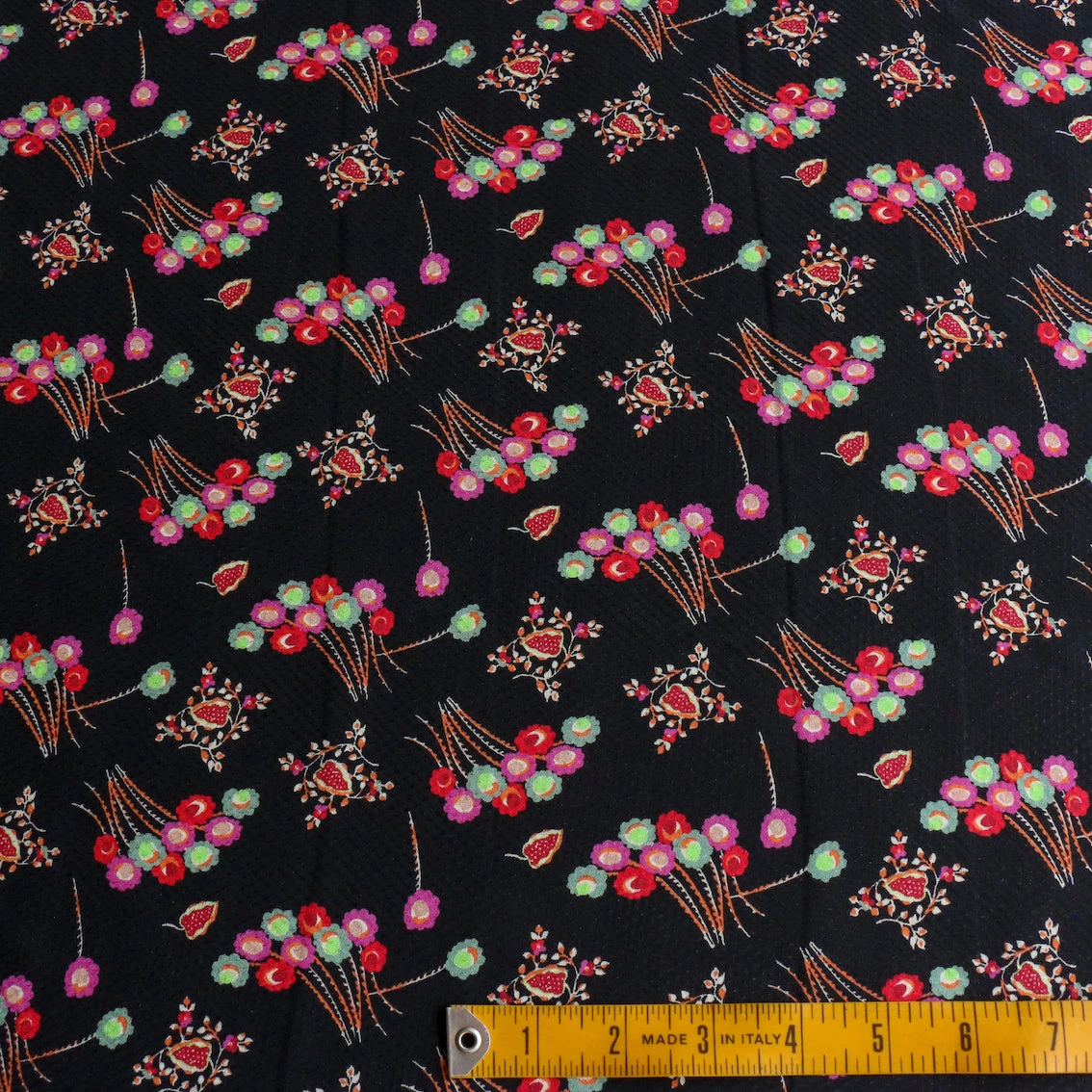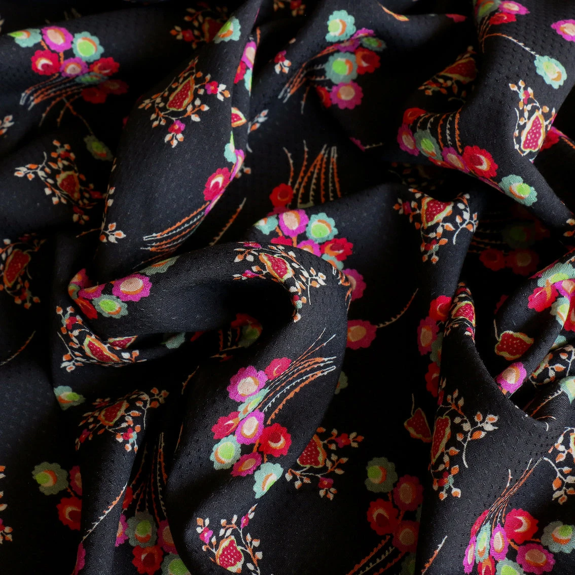 Italian black/green floral printed 100% viscose challis with jacquard spot